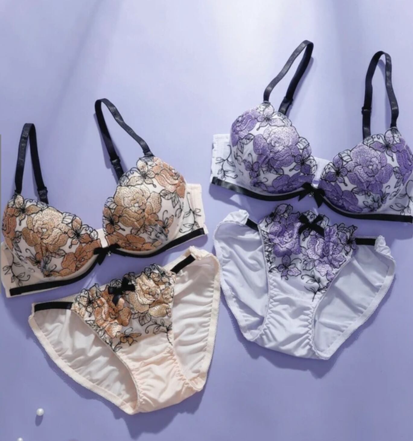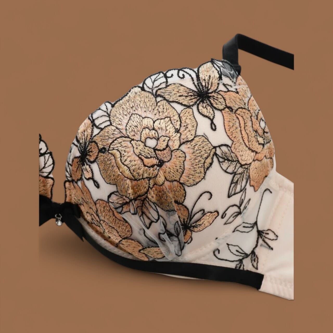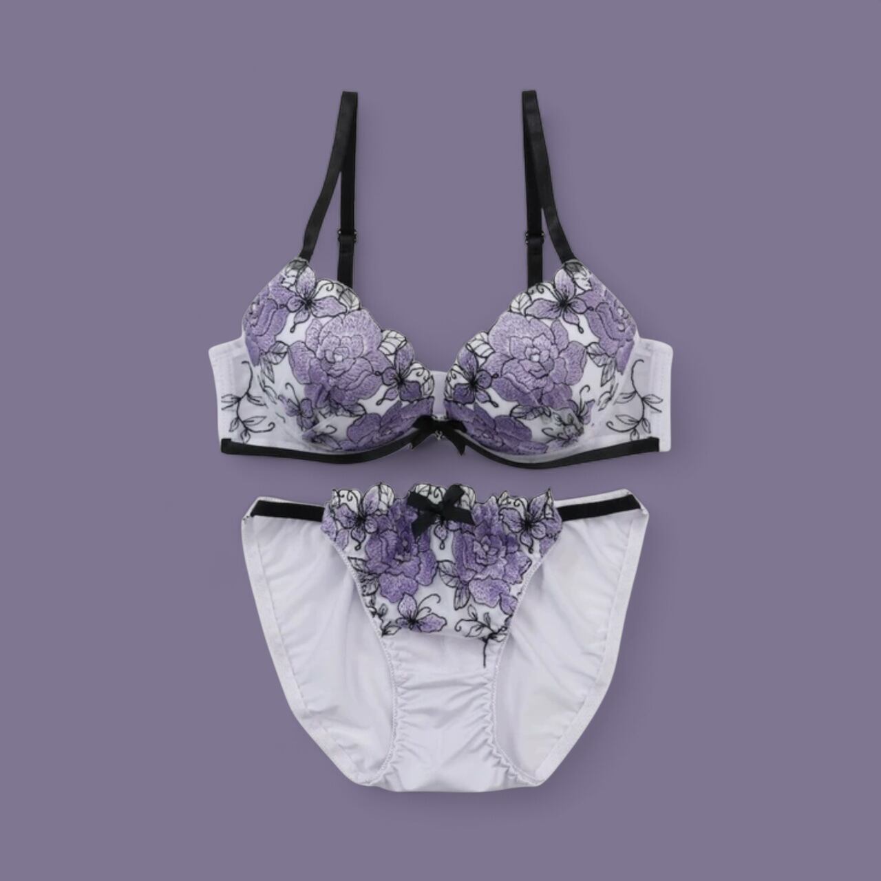 大ぶな薔薇の刺繍が華やかほどこされ、上品でセクシーな印象のブラセット!