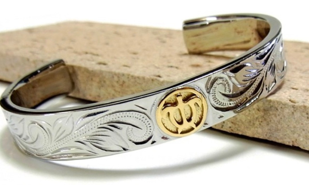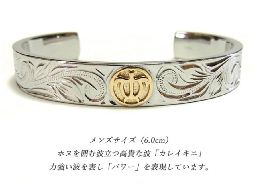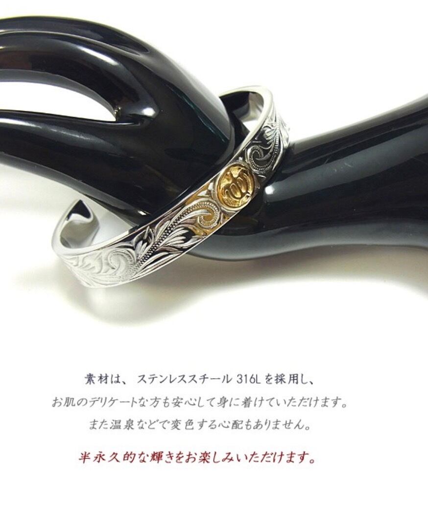 ハワイでは愛する人から想いを込めてハワイアンジュエリーを贈る習慣があります★遠い昔からハワイアンジュエリーは人々の大切な想いとともに身に着けられてきました。 使用貴金属ステンレススチール316L/K18イエローゴールドコーティング サイズ 太さ:10.5mm 厚み:3mm サイズ:6cm(主に男性おすすめサイズ)ステンレススチール当店のステンレスは、医療用品にも使われているサージカルステンレス316Lです。変色もせず・傷・汚れにも強く、アレルギーを起こしづらい安心な素材です。 半永久的な輝きを演出します!