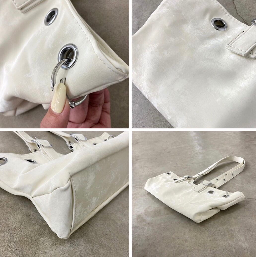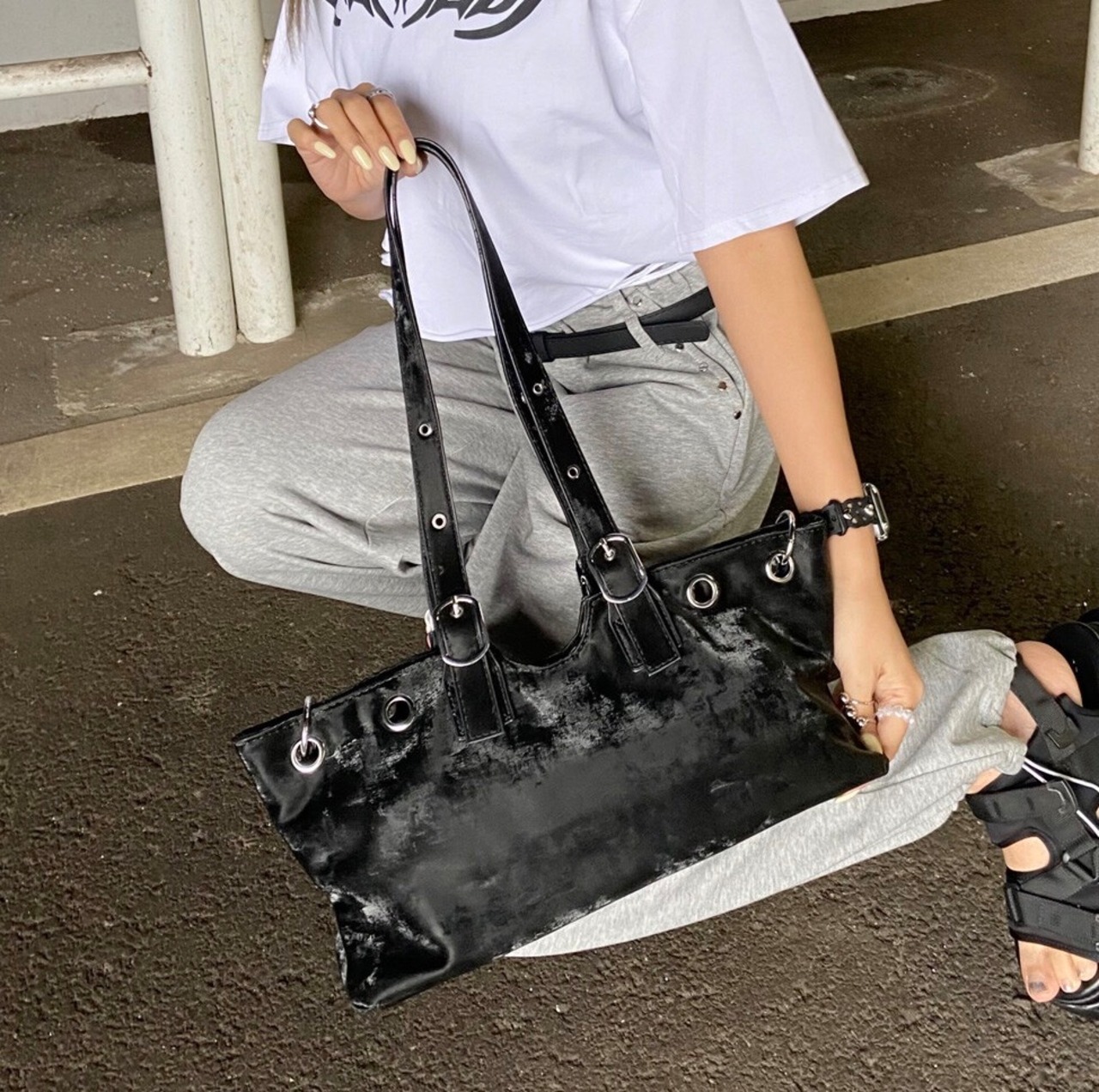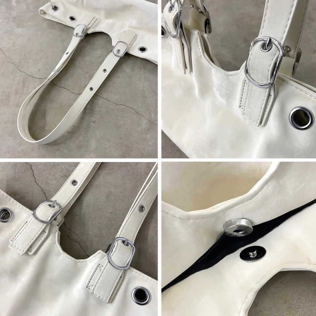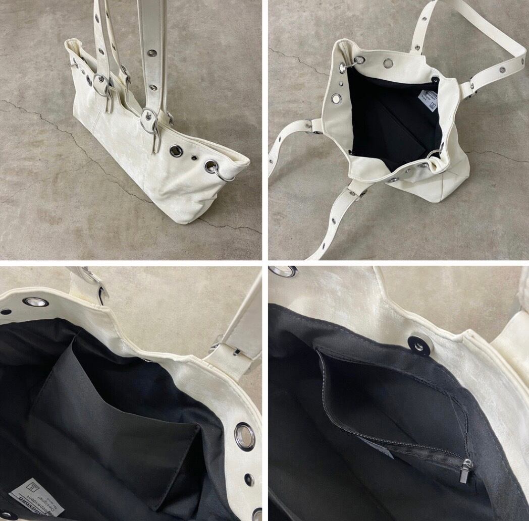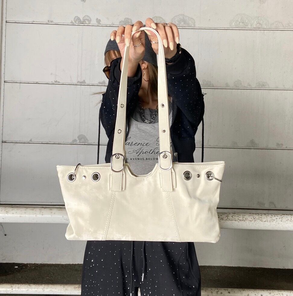 ハトメリングトートバッグ 合成皮革 フェイクレザー 横長バッグ スタッズ