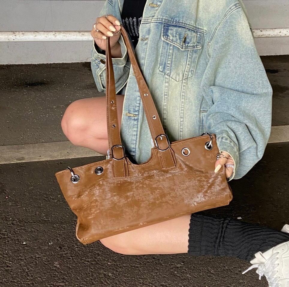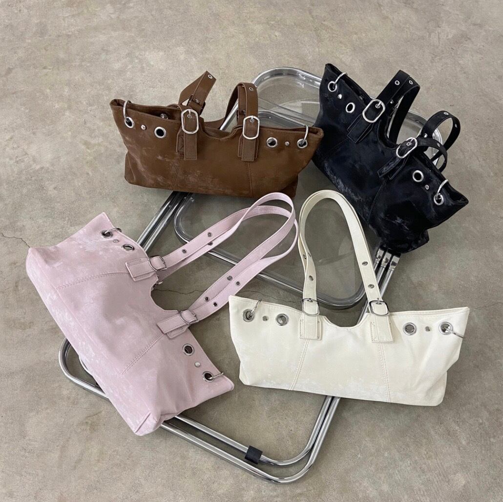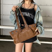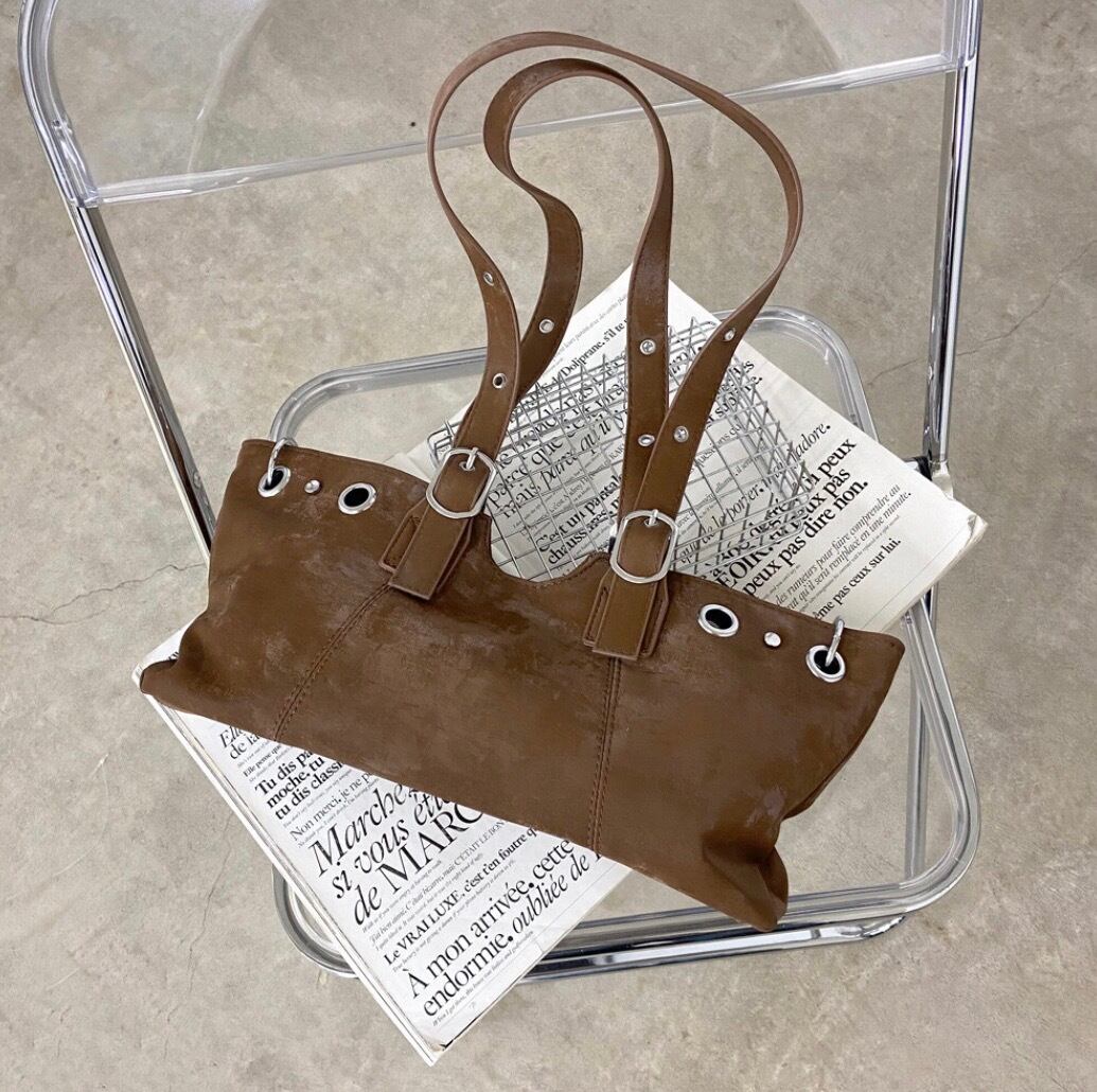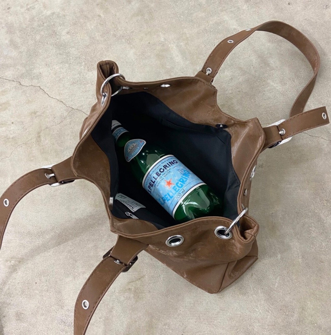 ハトメリングトートバッグ 合成皮革 フェイクレザー 横長バッグ スタッズ